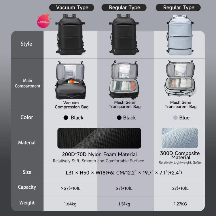2. Vacuum Compression Backpack with Built-in Air Pump – Enhances travel efficiency by expanding storage capacity while reducing bulk. (Vacuum Version Only)